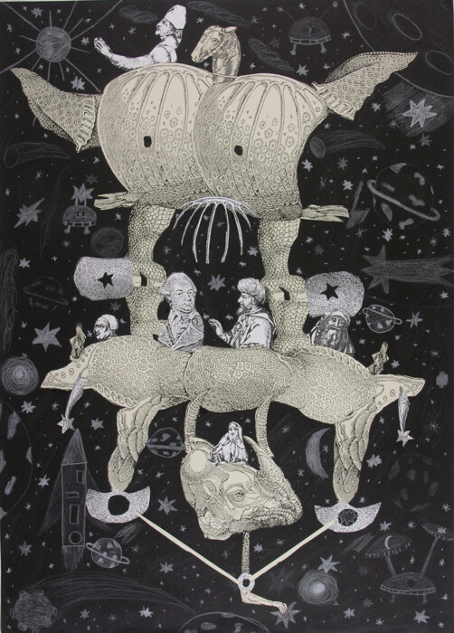 Schwarz-Weiß-Collage und Kreidezeichnung