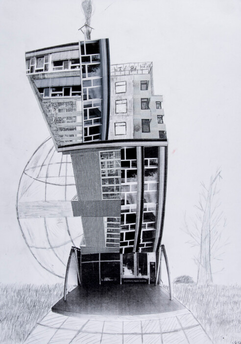 Collage aus Schwarz-Weiß-Fotokopien und Zeichnung