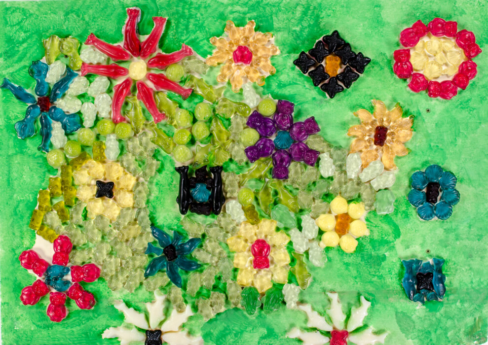 Arbeitsphase 2: Das Motiv wird von den Schülern selbständig überprüft. Dann kleben sie die Fruchtgummis mit Bastelkleber auf die Holzplatte auf. Entstehende Zwischenräume werden mit Acrylfarben bearbeitet. Hierfür sollen die Schüler Farben und Motive wählen die zu den aufgeklebten Fruchtgummis passen.