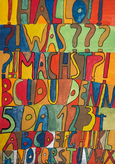 Schrift mit Malerei, Farbkreiden, Farbstiften