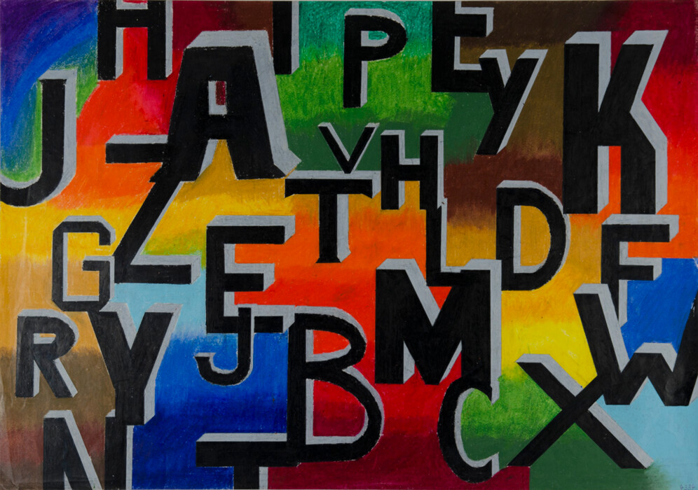 Schrift mit Malerei, Farbkreiden, Farbstiften