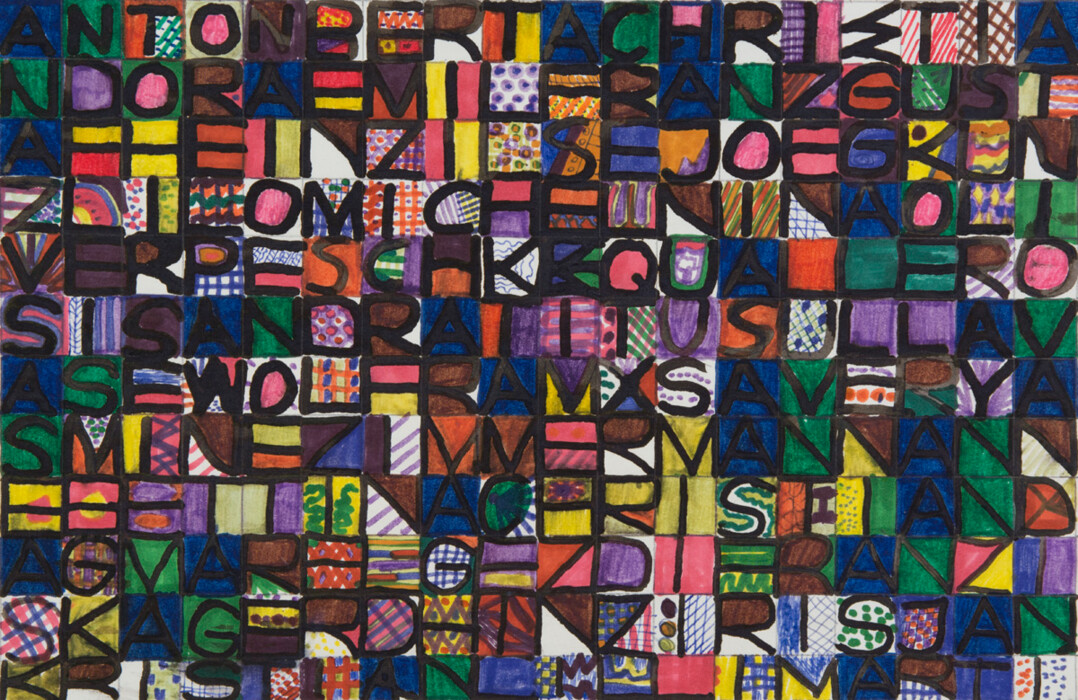 Schrift mit Malerei, Farbkreiden, Farbstiften