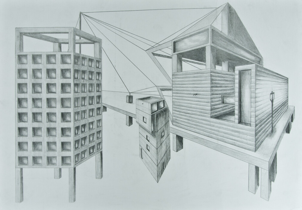 Geometrisches Zeichnen mit mehreren Fluchtpunkten: Gebäude