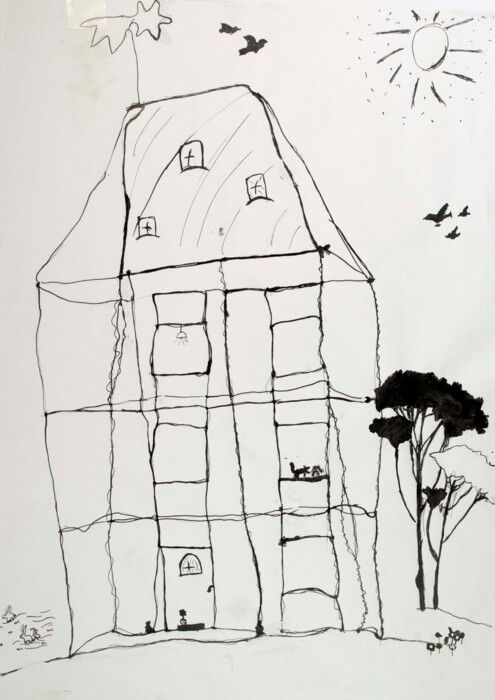 Aufgabenstellung/Unterrichtsverlauf: 1. "Wir stapeln hoch" -Ausgehend von der Idee des Buches "Die Hochhausstapler" von Germano Zullo und Albertine "bauen" die Schülerinnen zeichnerisch in die Höhe.Überlegungen und Untersuchungen zu realisierbaren Architekturen schließen sich an.2. "Wir bauen aus Linien Häuser" Die zeichnerischen Ideen werden mit Draht ins Dreidimensionale umgesetzt.Es entstehen Drahthäuser.3. Die Drahthäuser bilden den Ausgangspunkt für eine Weiterführung.Eine Schattenzeichnung des Hauses mittels Projektion wird mit Tusche ausgeführt und die nun zeichnerisch festgehaltene Architektur wird im Bild erweitert.Erweiterungen, wie sie im Bild vorgenommen wurden, werden anschließend, wenn mög-lich, auch im Drahthaus vorgenommen.Hinweise: Das Bauen mit Draht erfordert einiges an Geschick.Durch Löten lässt sich dies deutlich vereinfachen (siehe "Naturwissenschaft und Technik")