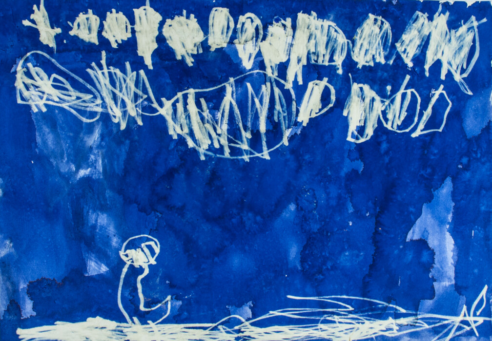 Darauf werden mit Tintenkiller Spuren gezogen (Schneesturm, Schneeflocken, Personen).