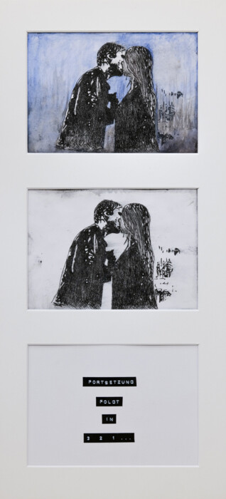 Zeichnung des Szenenbilds gestalten und als Radierung auf Acrylglas übertragen. Zwei Drucke des Druckstocks anfertigen. Den einen Druck mit Aquarellfarbe kolorieren. Die Reihe beenden mit einem dritten Blatt, das eine verheißungsvolle Ankündigung zum Ausdruck bringt.