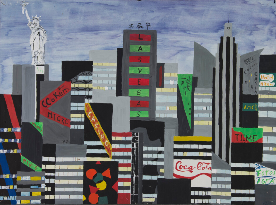Collage aus Zeitungspapieren mit Deckfarben und Stiften
