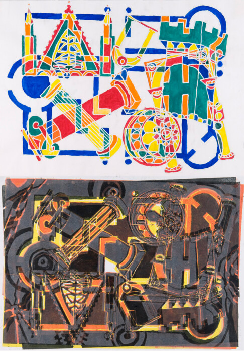 Bunte Zeichnung und Linoldruck (Verlorene Platte)