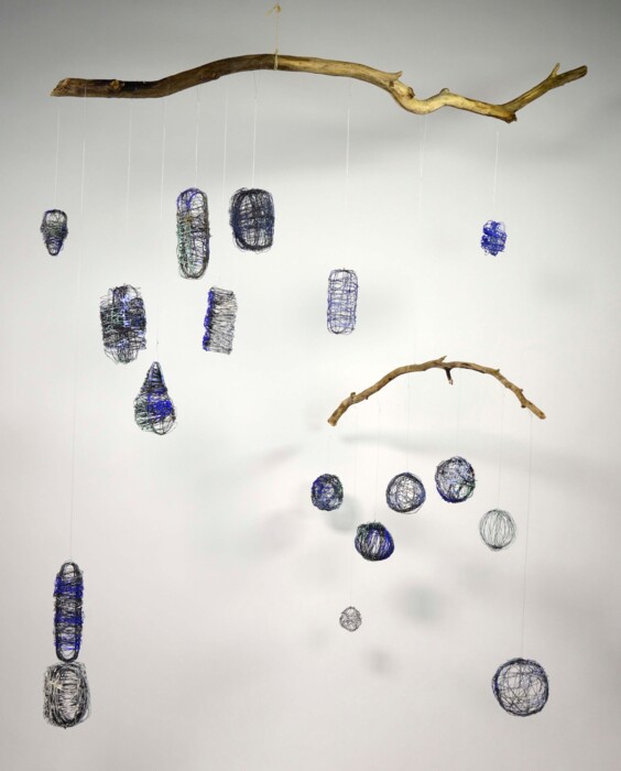 Übrig bleiben die Drahtgeflechte. Diese werden mit kalten Farben bemalt und zu einem Mobile arrangiert.