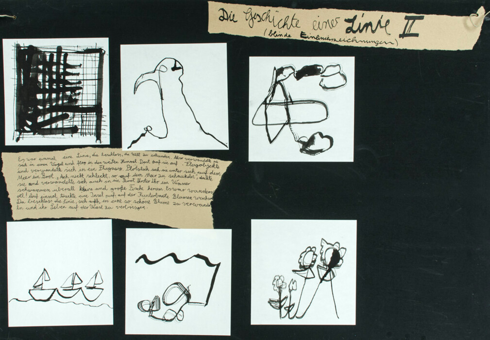 Zu bestimmten Begriffen (z. B. Chaos, Stadt, Tier, Flugobjekte) werden blind Einlinienzeichnungen erstellt.