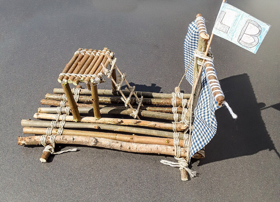 Nachdem die Schüler Stöcke gesammelt hatten, lernten sie verschiedene Knoten kennen. Mit Hilfe der Knoten wurden die Plattformen zusammen geknotet. Die Flöße bekamen noch ein Mast mit einem Segel. Zum Schluss bauten die Schüler noch Aufbauten z.B. Rutschen, Schaukeln, Aussichtsplattformen, …