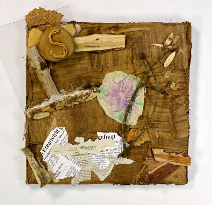 Auf einen Keilrahmen (36x36cm) sollen unter Farbauftrag (Malerei: Acrylfarben, Buntstifte) Materialien, z.T. Naturmaterialien aufgebracht werden und diese Montage unter Verwendung von Plexiglas (neuer Zusammenhang: Plexiglas als Lupe) unter der Lupe betrachtet werden,
