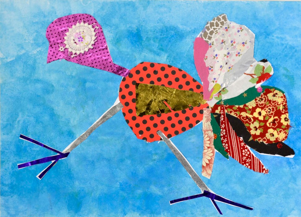 2. Aufgabenstellung: Gestalte deinen Fantasievogel formatfüllend mit Hilfe unterschiedlichster Collagematerialien ( Papier, Stoff, Borte, Tortenspitze, Goldfolien )