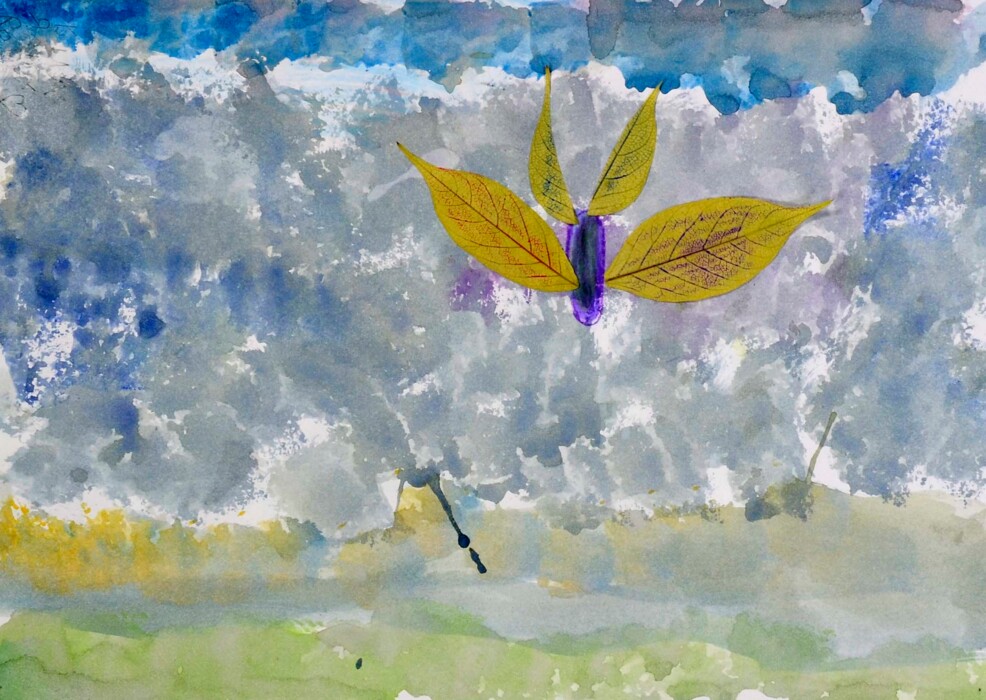 3. Weiterführung: Schüler tupfen mit Schwämmchen und Wasserfarben einen Hintergrund in 1-2 Farben, auf den sie den zuvor ausgeschnittenen Fantasievogel kleben