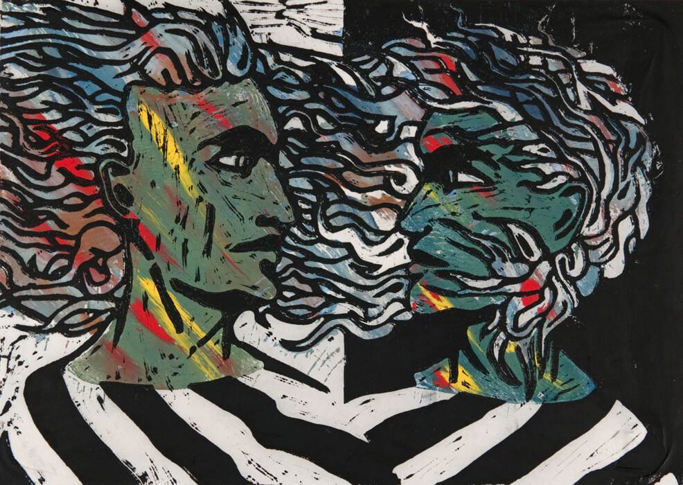 bunt gedruckter Hintergrund mit schwarz überdruckt