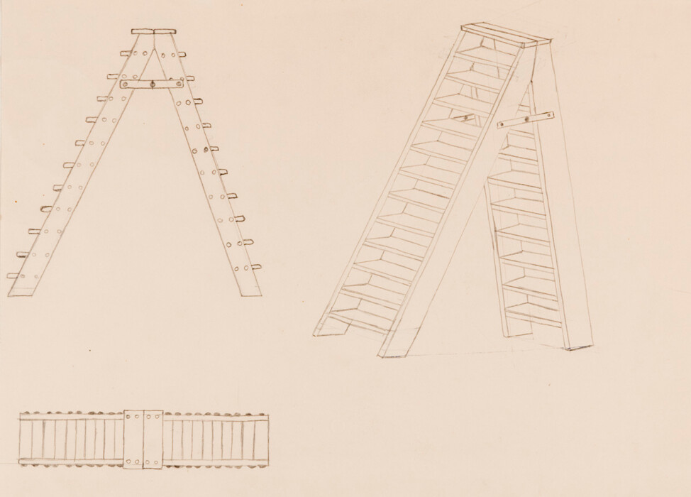 Seiten- und Schrägansicht einer Bockleiter, geschlossene Leiter