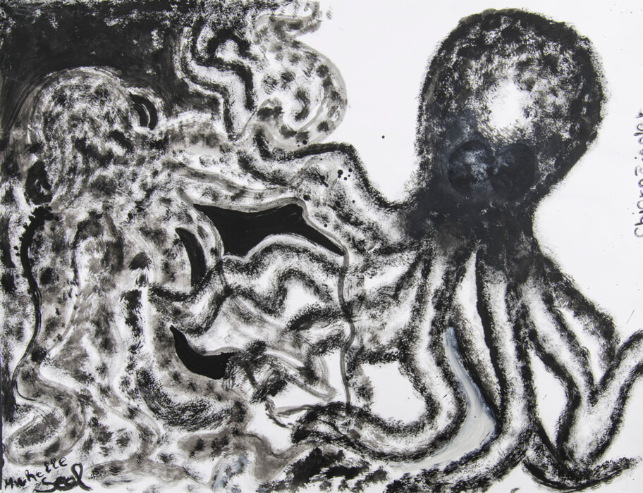 - nach dieser akribischen Kleinarbeit: großformatige Befreiung in Partnerarbeit auf der Basis genauer Formkenntnisse zum Thema Kampf der Kraken: Tintenstöße und Umschlingungen