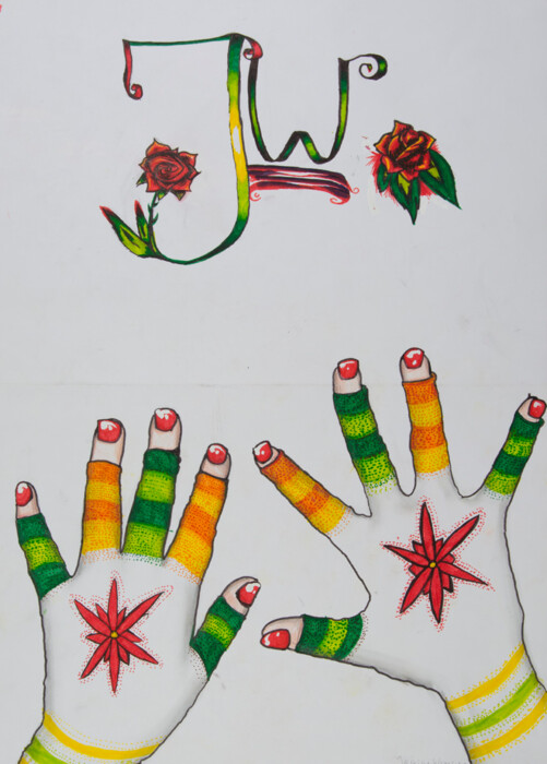 Schrift mit Malerei, Farbkreiden, Farbstiften
