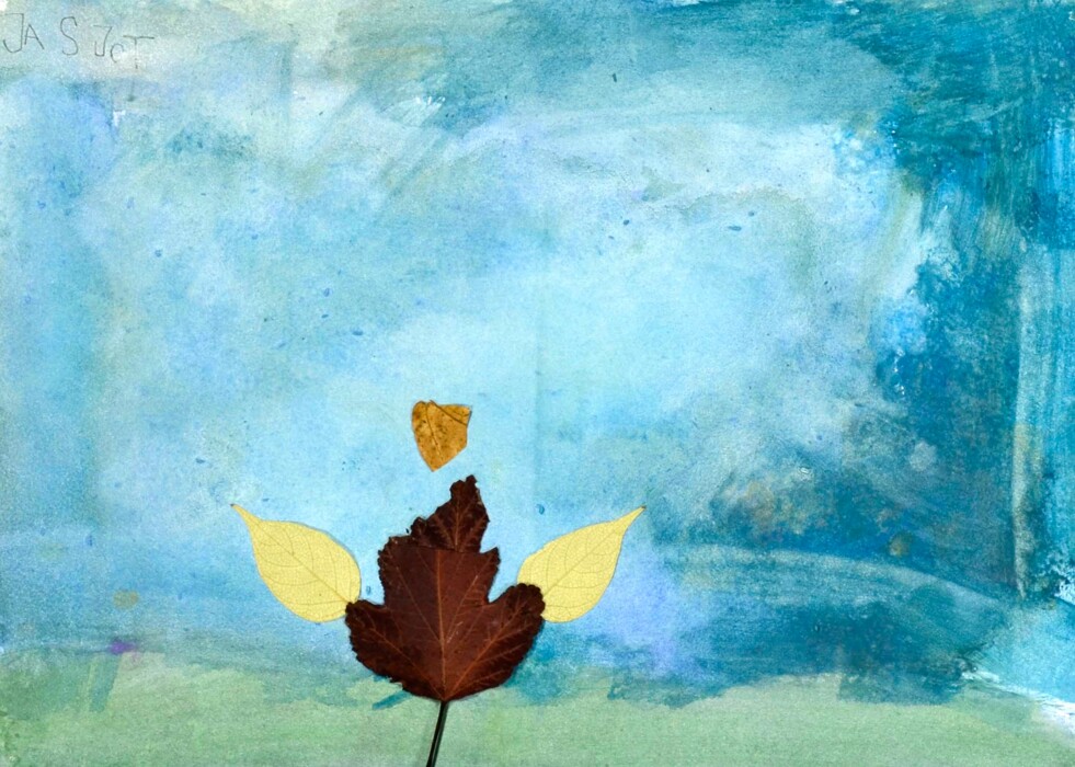 Anregungen: Den Fantasievogel erst auf weißes Papier kleben lassen, anschließend ausschneiden und erst dann auf den gestalteten Hintergrund kleben