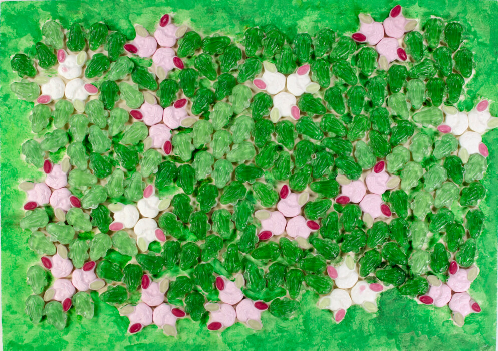 Arbeitsphase 2: Das Motiv wird von den Schülern selbständig überprüft. Dann kleben sie die Fruchtgummis mit Bastelkleber auf die Holzplatte auf. Entstehende Zwischenräume werden mit Acrylfarben bearbeitet. Hierfür sollen die Schüler Farben und Motive wählen die zu den aufgeklebten Fruchtgummis passen.