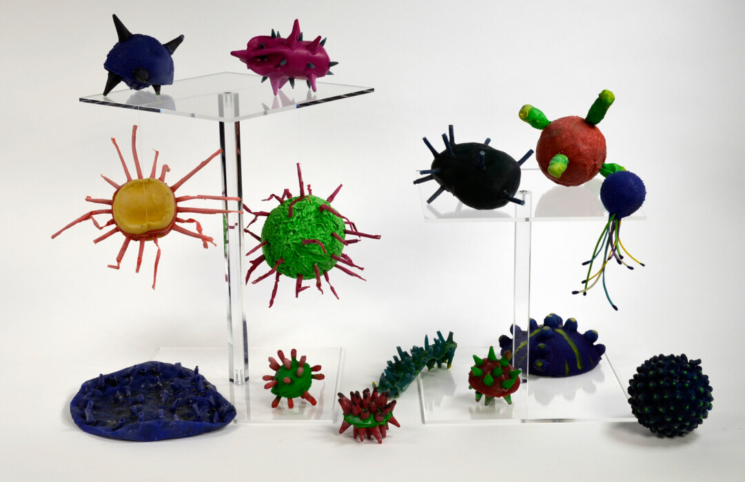 Hinweise:- Vorwissen (Viren, Bakterien) aus dem Biounterricht Klasse 8- Die Wirkung von Positiv und Negativ eines Objektes stellte eine Herausforderung dar. - Große Ausdauer wird gefordert durch das Auftragen mehrerer Gummischichten, bis eine brauchbare Gummihaut abgezogen werden kann.Bezug zur Kunst und/oder ästhetischen Umwelt: - Objekte aus der Vorstellung und Anschauung erkennen, sowie eine ästhetisch-forschende Haltung bei der Auseinandersetzung mit der "unsichtbar" gestalteten Umwelt entwickeln. - Die Anregung für diese Unterrichtseinheit resultiert aus der Lehrerkräftefortbildung "Artenreich – Objekte aus Latex" unter der Leitung der Künstlerin Frau Susanna Messerschmidt aus Stuttgart.