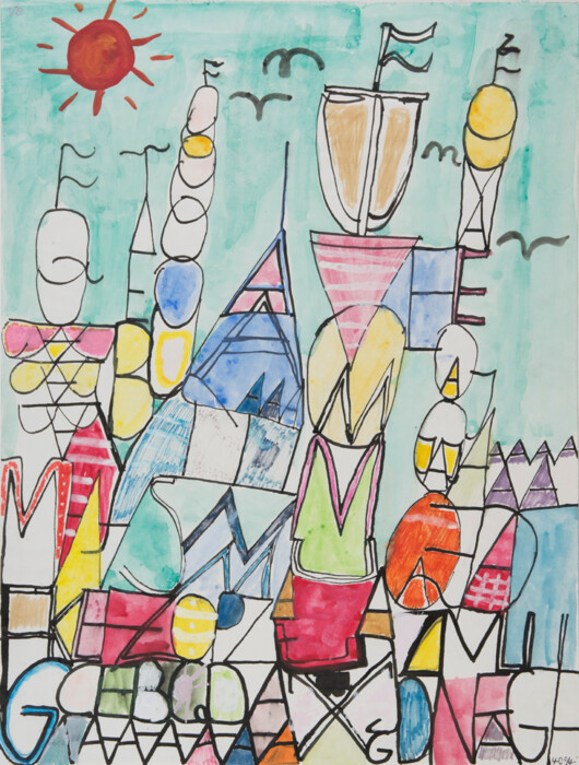 Schrift mit Malerei, Farbkreiden, Farbstiften