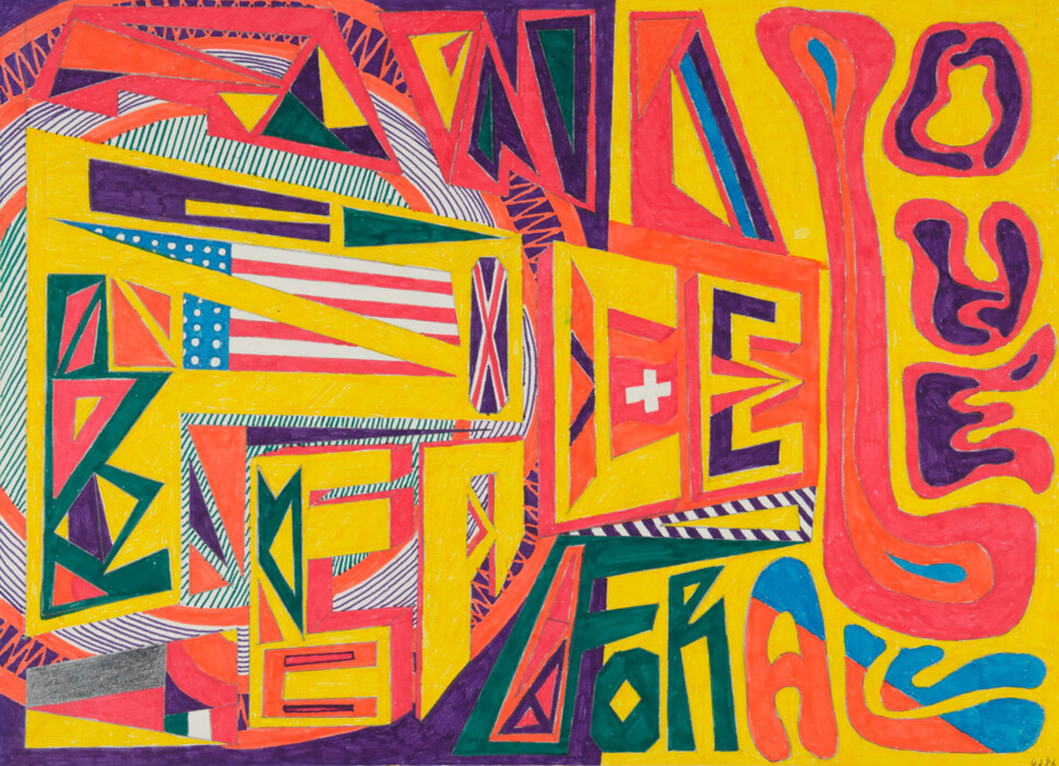 Schrift mit Malerei, Farbkreiden, Farbstiften