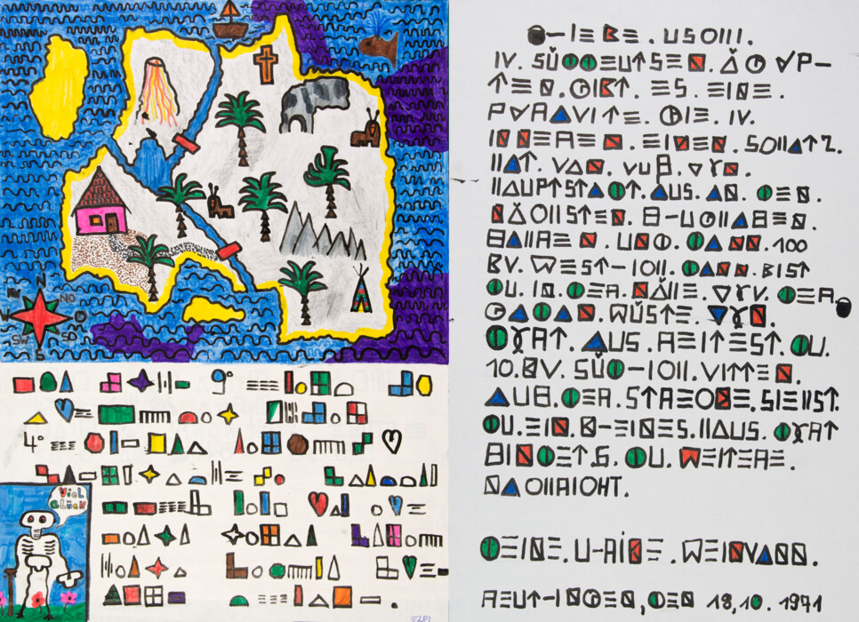 Schrift mit Malerei, Farbkreiden, Farbstiften