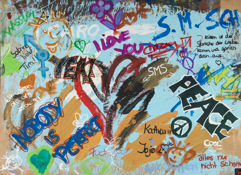 Schrift mit Malerei, Farbkreiden, Farbstiften