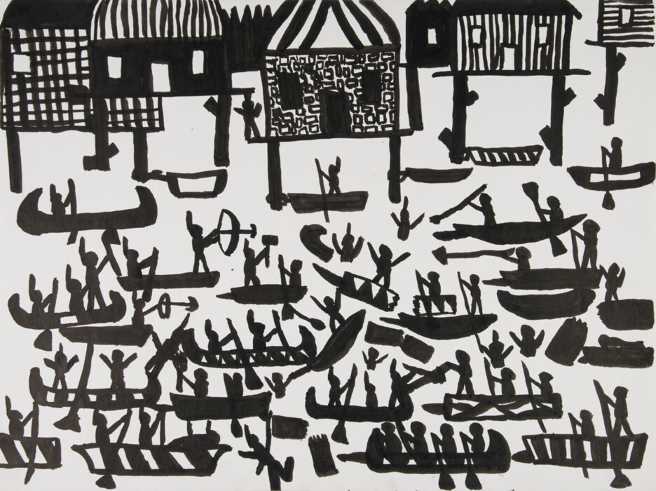 Indianer in ihren Booten vor der Pfahlbausiedlung