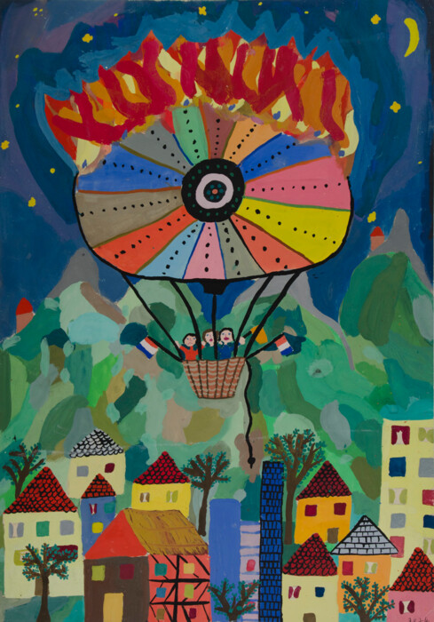 Ein Heißluftballon fährt über Häuser