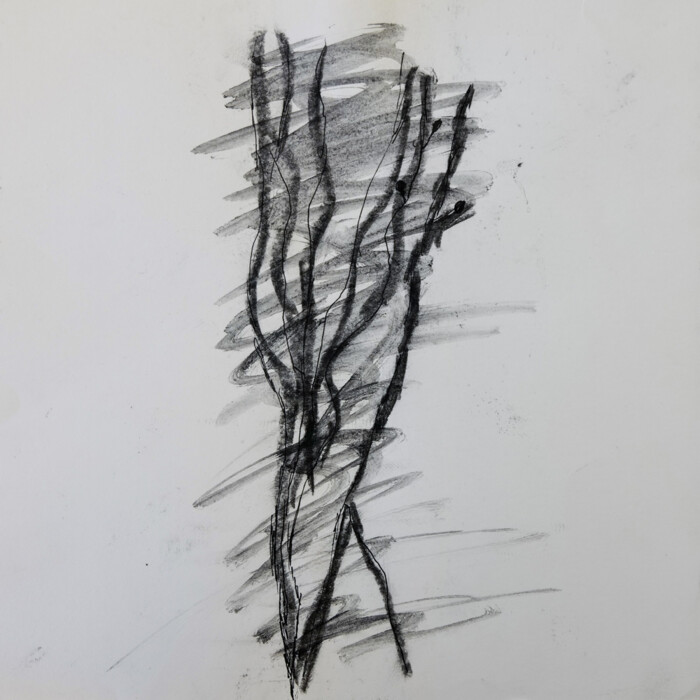Aus gesammelten Ästen entstehen Astwerke, deren Schattenwurf auf einer mit Pigment und Ei grundierten Leinwand mit durch Ästen verlängerten Pinseln mit Tusche gemalt wird. Skizzen mit Kohle, Bleistift und Tusche entstehen von den jeweiligen Objekten.