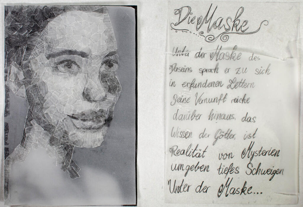 Auf eine schwarz-weiß Kopie eines Gesichtes aus einer Zeitschrift wird ein Transparentpapier gelegt. Das durchscheinende Gesicht wird mit Schnipseln aus Transparentpaier collagiert und anschließend mit Bleistift schraffiert.