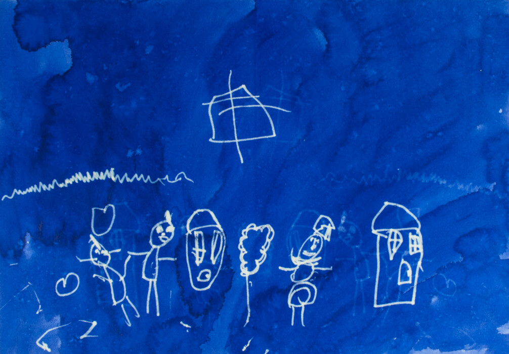 Darauf werden mit Tintenkiller Spuren gezogen (Schneesturm, Schneeflocken, Personen).