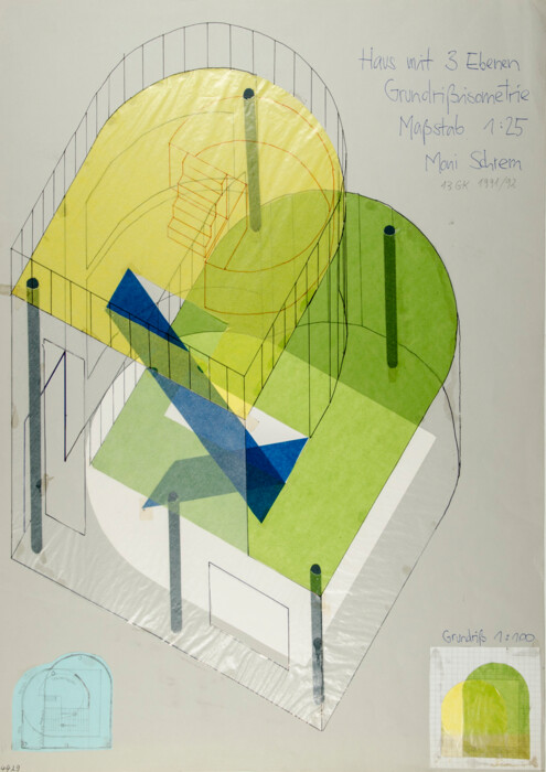 Bleistiftzeichnung und Farbstifte, Tusche, Transparentpapier