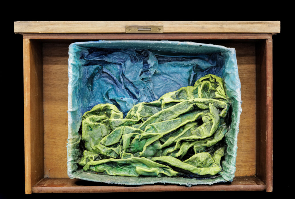 Tücher wurden in Gips getränkt und in Kisten drapiert. Die dabei entstandenen Falten der Tüche weckten Assoziationen zu Landschaftselementen wie Felsenriffen, Bergspitzen, Wolkenwirbeln und Meereswogen. Durch Bemalen der Falten mit lasierenden oder deckenden Acrylfarben wurden die assoziierten Landschaften Schicht um Schicht herausgearbeitet.