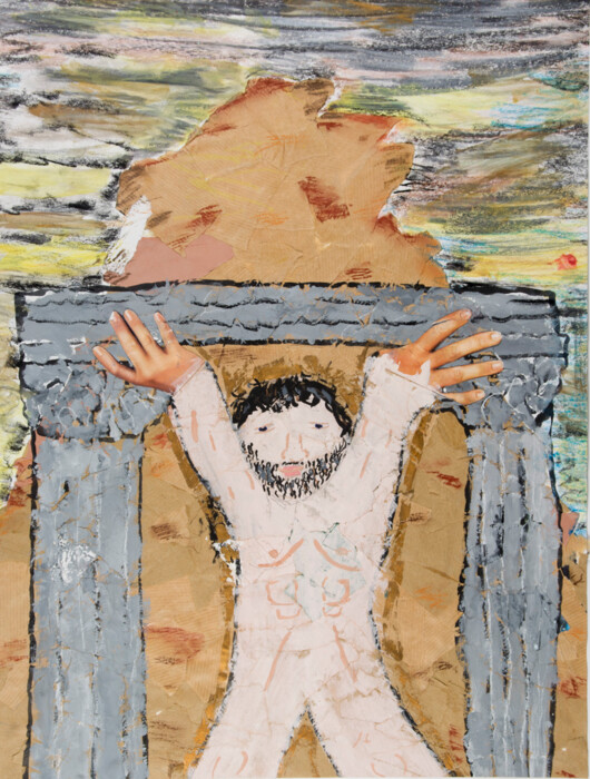 Collage aus Papier, Packpapier, Wellpappe; Deckfarben