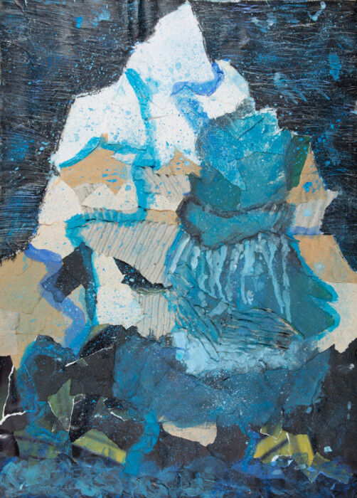 Collage aus Papier, Packpapier, Wellpappe; Deckfarben