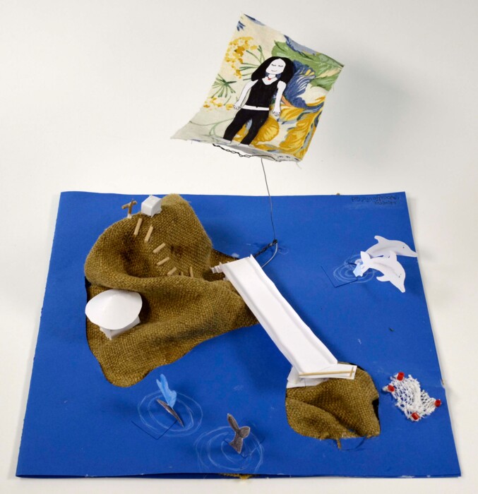 Bunte Stoffe in Musterbüchern aus einem Einrichtungshaus wurden in der Größe passend zu den Figuren zu fliegenden Teppichen zugeschnitten. Alte Rupfensäcke erinnern in Falten geworfen an eine kahle Landschaft – passend zu einer Insel, die aus dem Meer auftaucht.