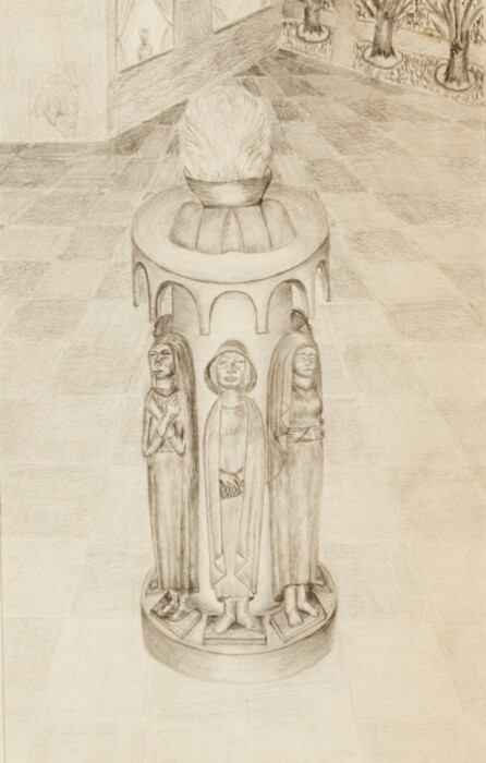 Skizze eines Denkmals mit Figuren der Lauschenden