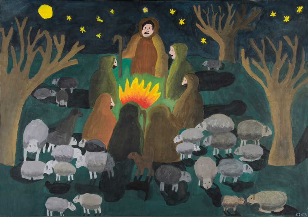 Hirten mit Herde ums Lagerfeuer