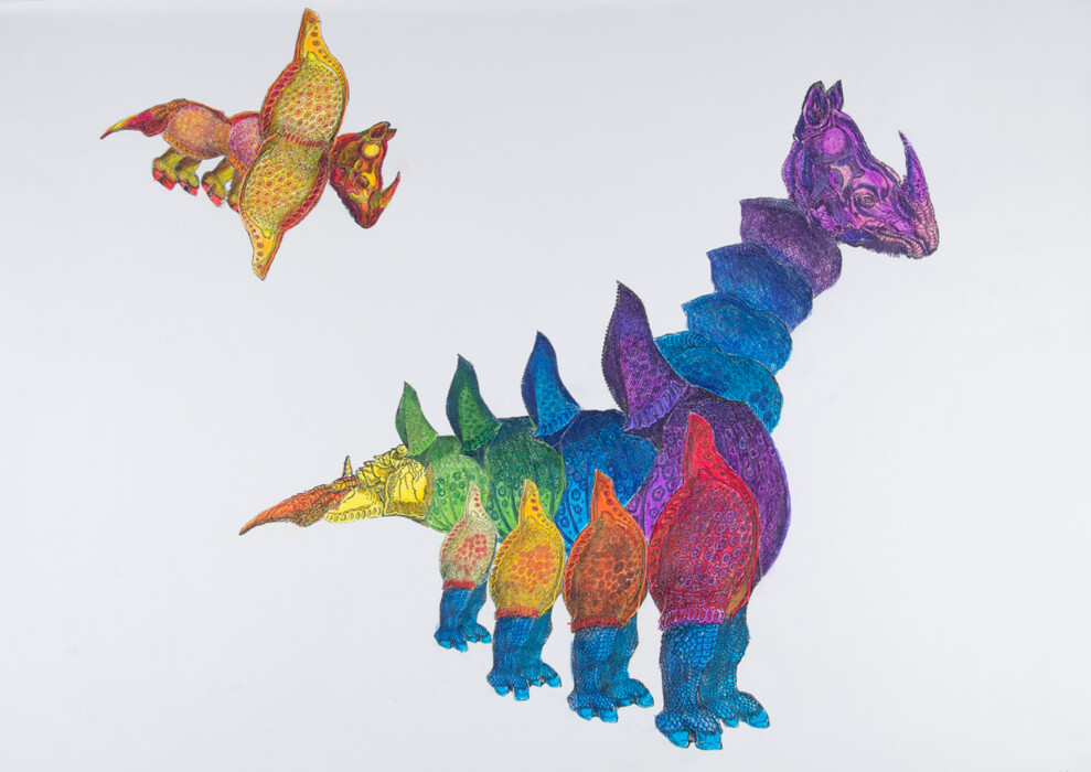 Collage aus Schwarz-Weiß-Fotokopien und Farbstiften