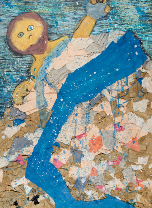 Collage aus Papier, Packpapier, Wellpappe; Deckfarben