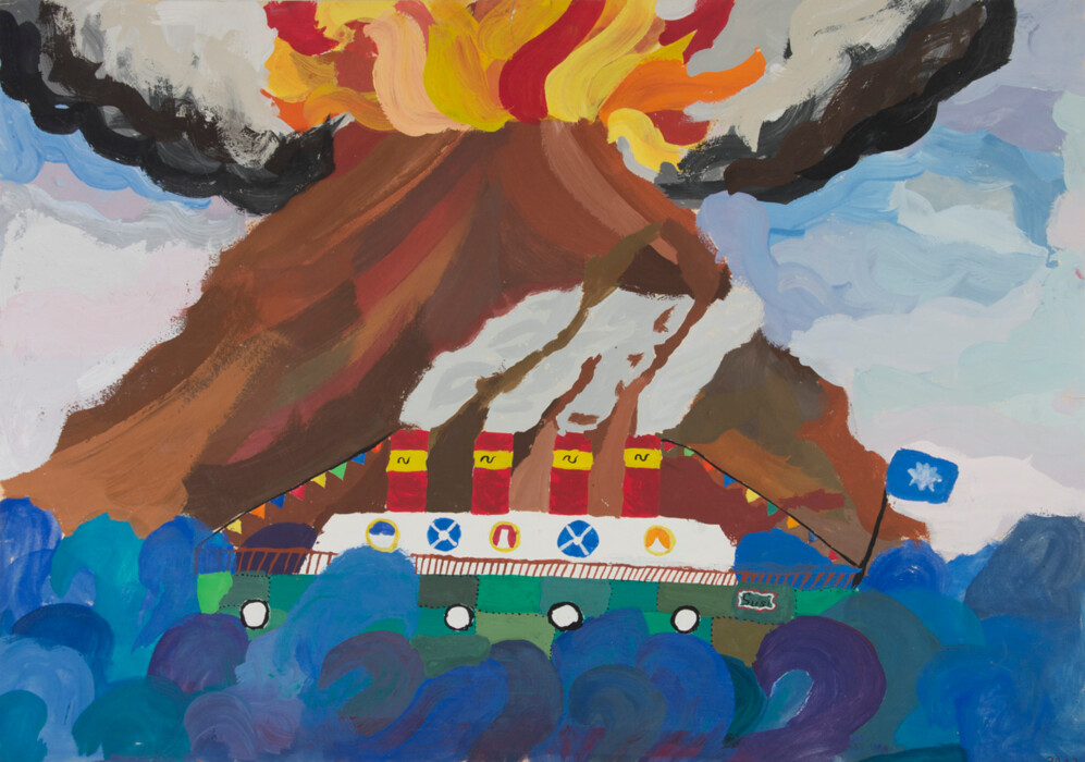 Ein Passagierschiff fährt an einer Vulkaninsel vorbei