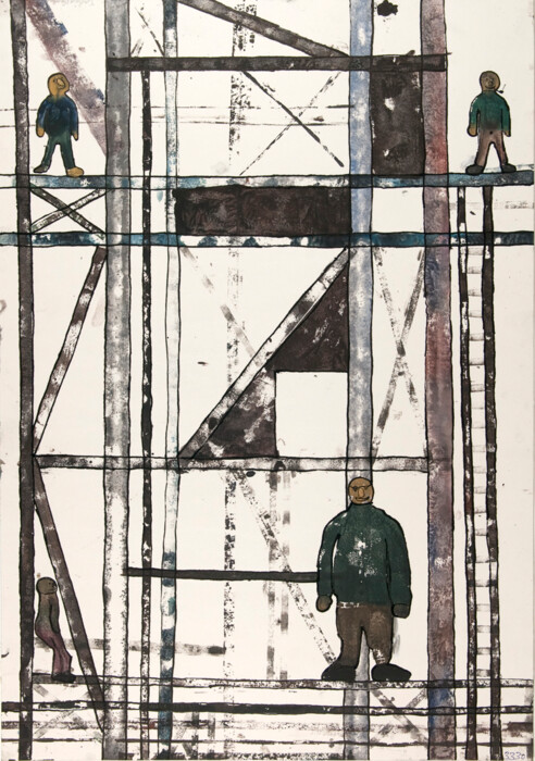 Kartondruck mit Deckfarben und Filzstiftzeichnung