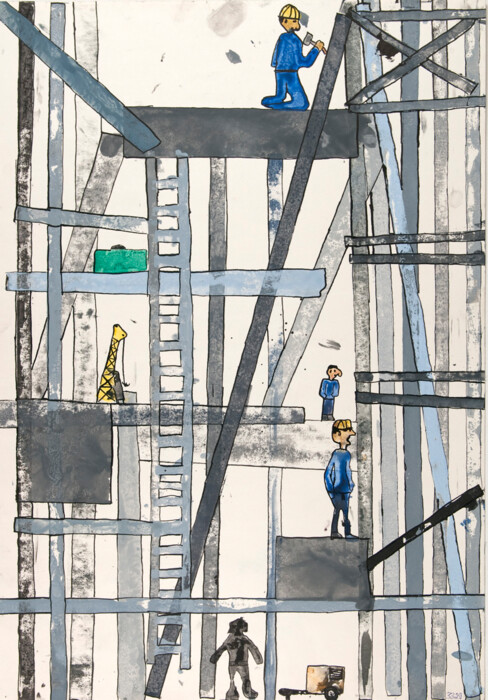 Kartondruck mit Deckfarben und Filzstiftzeichnung
