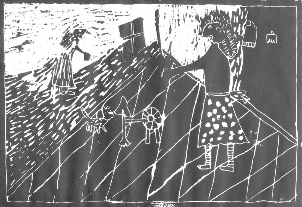 Szene aus Baba-Jaga: Das Mädchen füttert die Hunde mit Brot
