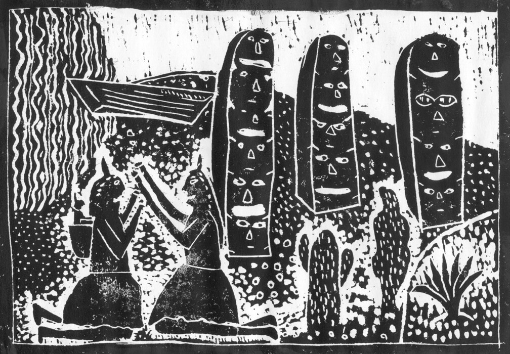 Zei Indianerfrauen sitzen bei den Totempfählen